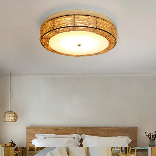 Compact Flush Mount Lighting Covered In Burly wood Wicker