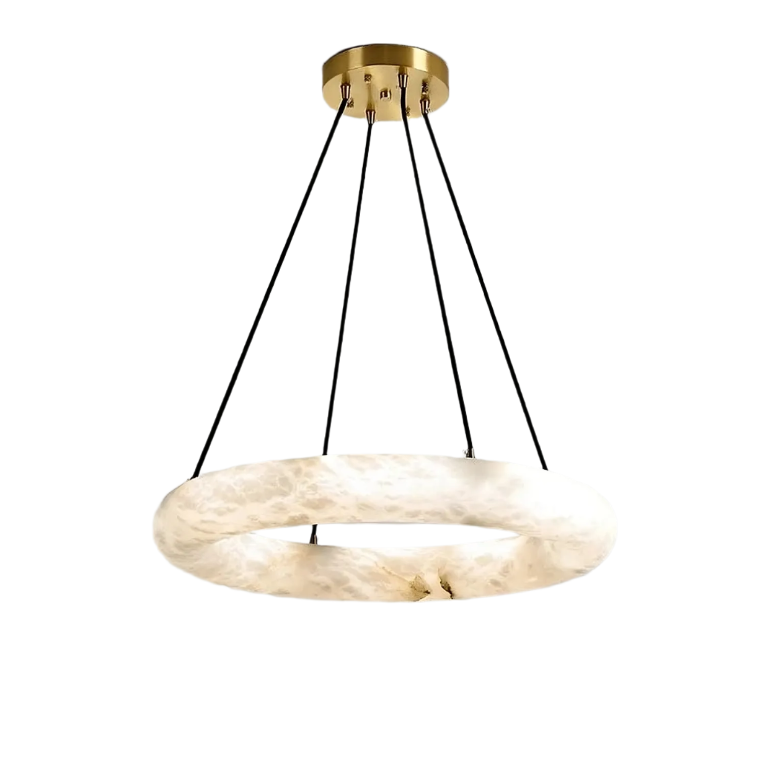 Enhance your home with our 20" Natural Marble Wheel Chandelier. Imported from Spain, the natural marble adds a touch of elegance while the adjustable wire length allows for versatile placement. Enjoy soft lighting and a brass ceiling plate for a complete look.