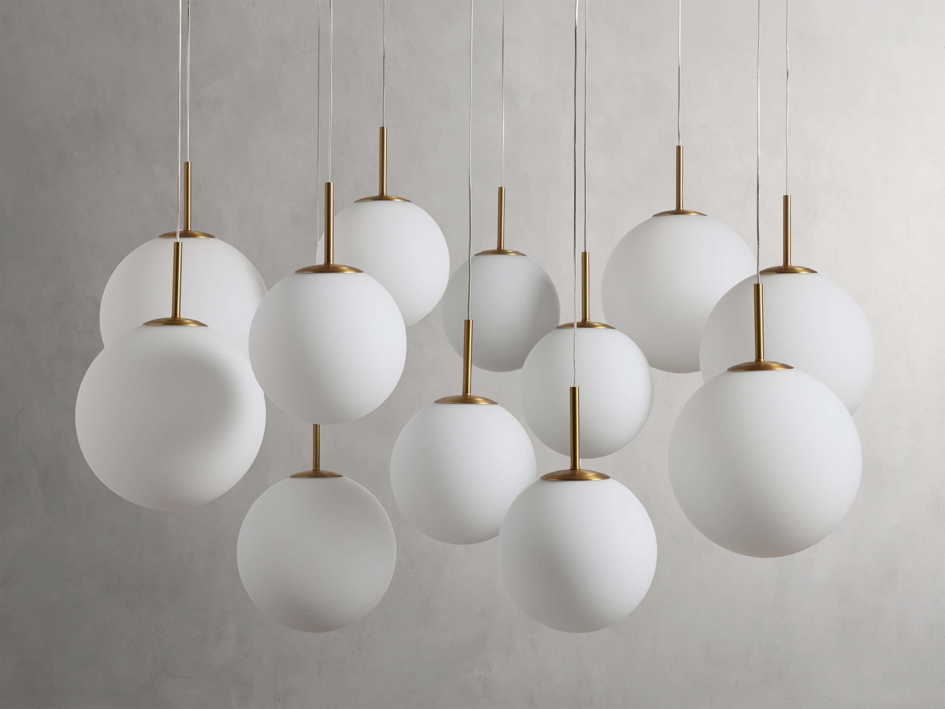 - Crafted from stainless steel with a satin brass finish and a mouth blown solid opal glass globe or crackle glass globe.