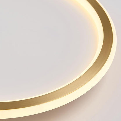 - The simple geometry ceiling light in circle shape has a smooth surface and uniform color, brass finish bottom and fully circle spread LED light around for exquisite decorative atmosphere. This stable flush mount installation with silicone lampshade and 45-Watt Dimmable LED has good light transmission performance. Blending with dimmable brightness (5% to 100%) adjustable, this integrated LED ceiling light can provide bright lighting for the living room/bedroom/corridor/dining/kids room.