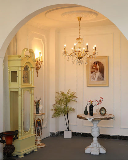 This Crystal Pearl Chandelier will add an elegant, luxurious touch to your living room or dining area. Its French candle style, full copper build, and crystal pearls add a classic, timeless look to the chandelier. Perfect for villas, Chinan restaurants, and bedrooms.