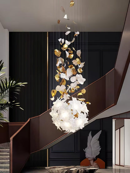 Our Flying Flowers Fluttering Chandelier offers a breathtakingly elegant aesthetic with its ivory glass petals that resemble fluttering petals descending gracefully from the light. Its luxuriously intricate design exudes a sophisticated and exclusive air, elevating the ambience of any interior.