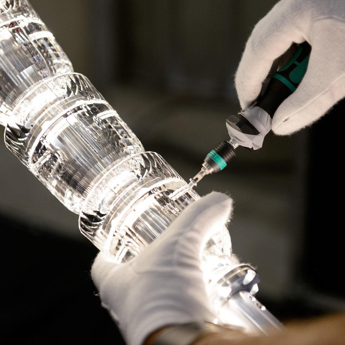 This Gabriel Chandelier C from our collection embodies the fluidity of movement and the elegance of minimalist design. The installation features sinuous curves and intertwining loops, like a sculptural snake suspended in mid-air. Each section is carefully crafted and connected to form a harmonious acrylic trajectory that meanders seamlessly, evoking the elegance of crystal and the fashion of modern art.