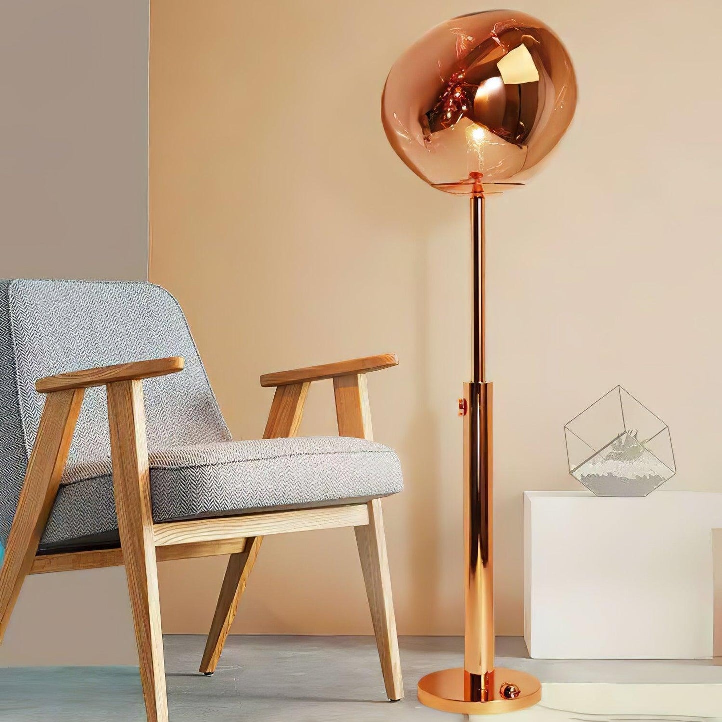 The Lava Art Floor Lamp features a slim and sleek frame supporting a captivating orb full of a series of complex lights, creating a mesmerizing display of reflections and colors reminiscent of a sunset encased in glass. The polished copper finish not only adds a touch of elegance but also reflects the light show within, ensuring this floor lamp is a stunning functional decoration.