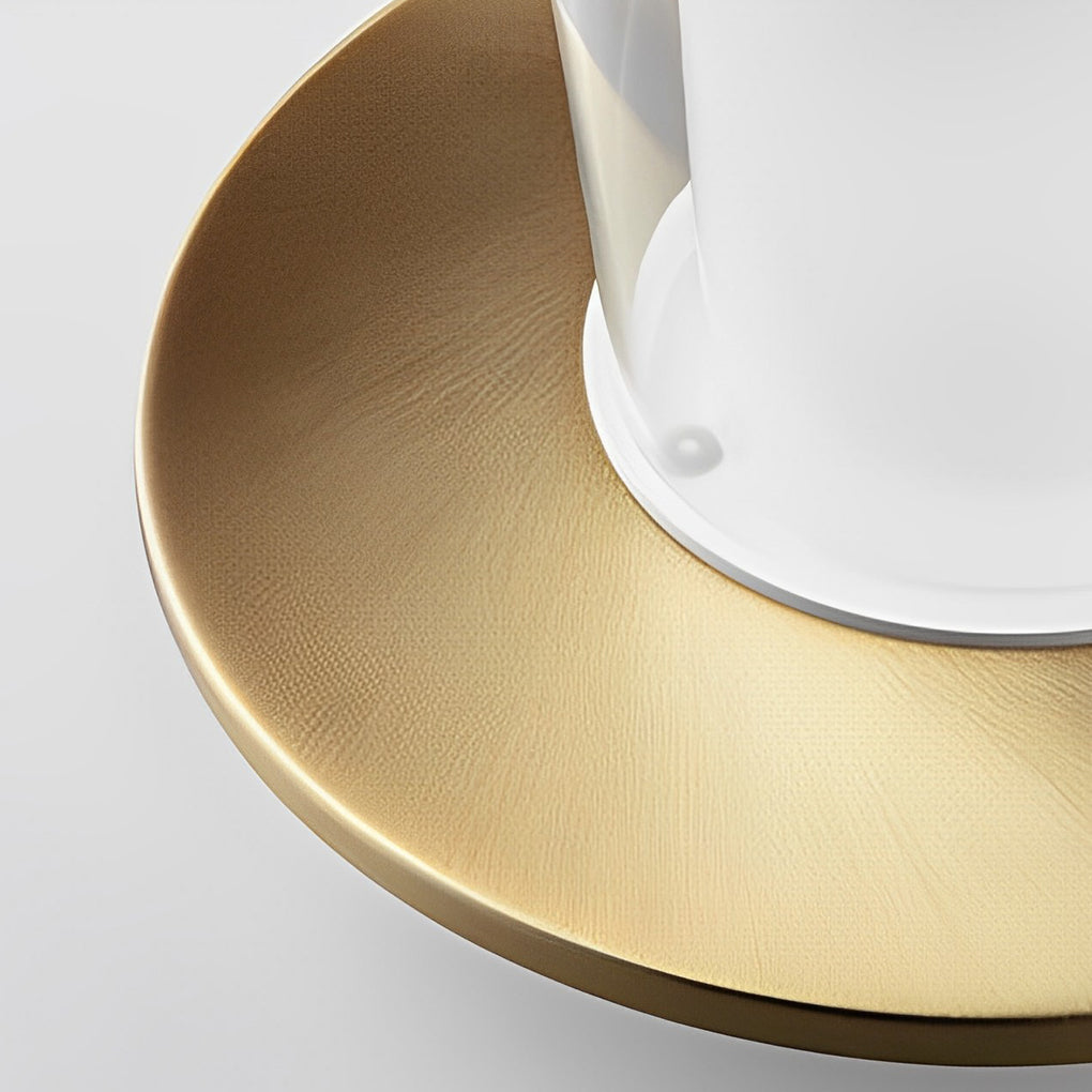 The simple, cylindrical shape of this double layered plastic shade table lamp is the perfect accent for modern decor. The contemporary look is elegant with a brass or nickel metal dish base. The short design is ideal for placement on a nightstand, desk, or accent table.