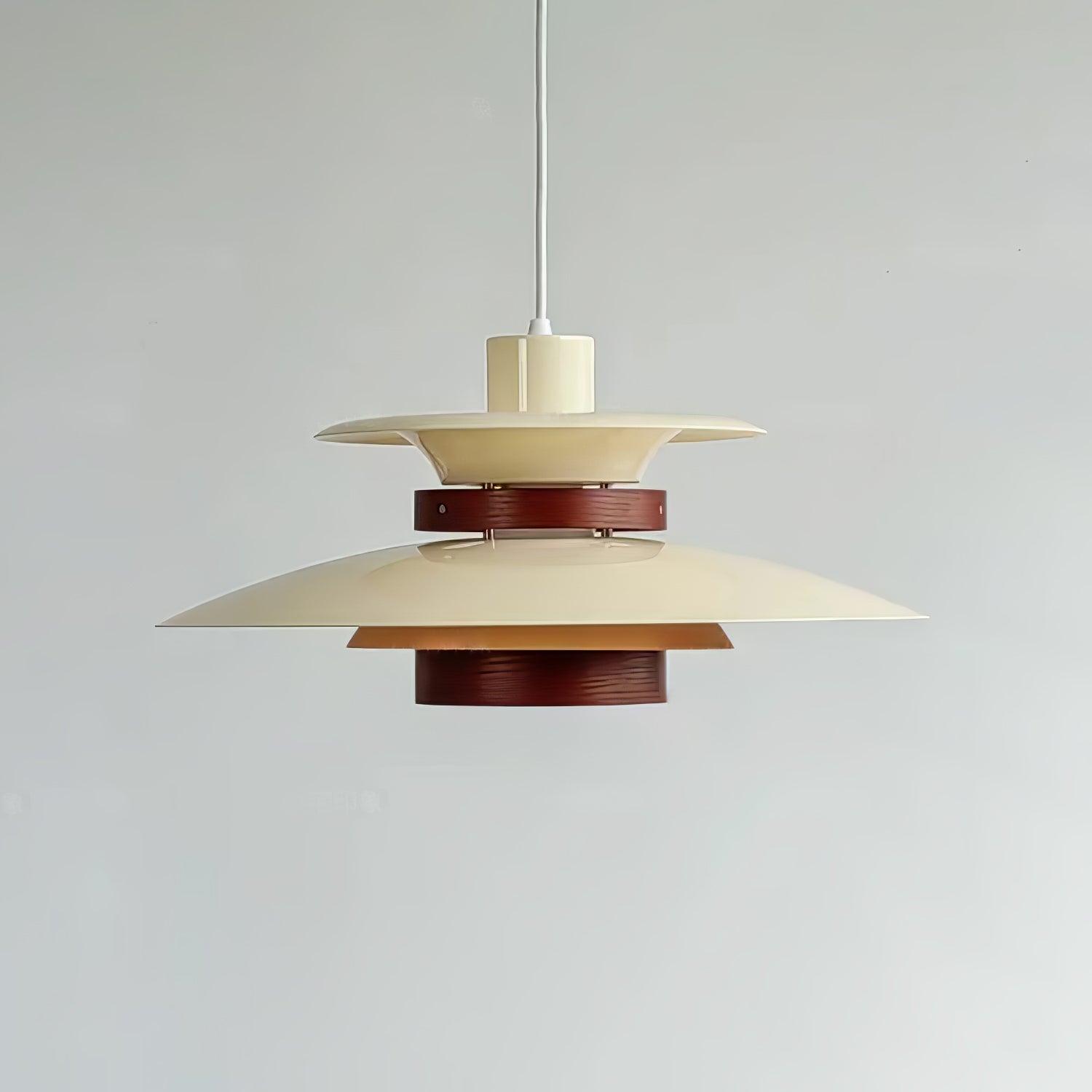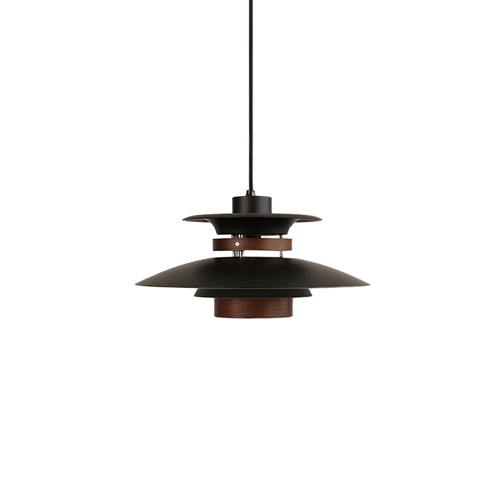 This elegant fixture exhibits a series of layered shades that produce a soft, diffused light, perfect for creating a warm and inviting atmosphere. The combination of sleek metal with warm wooden textures offers a modern twist on classic design elements.