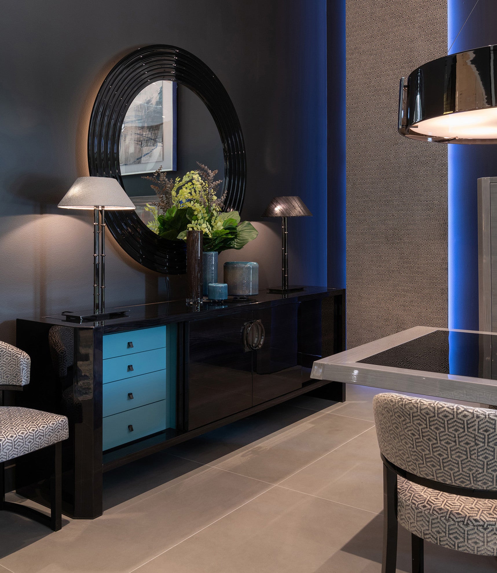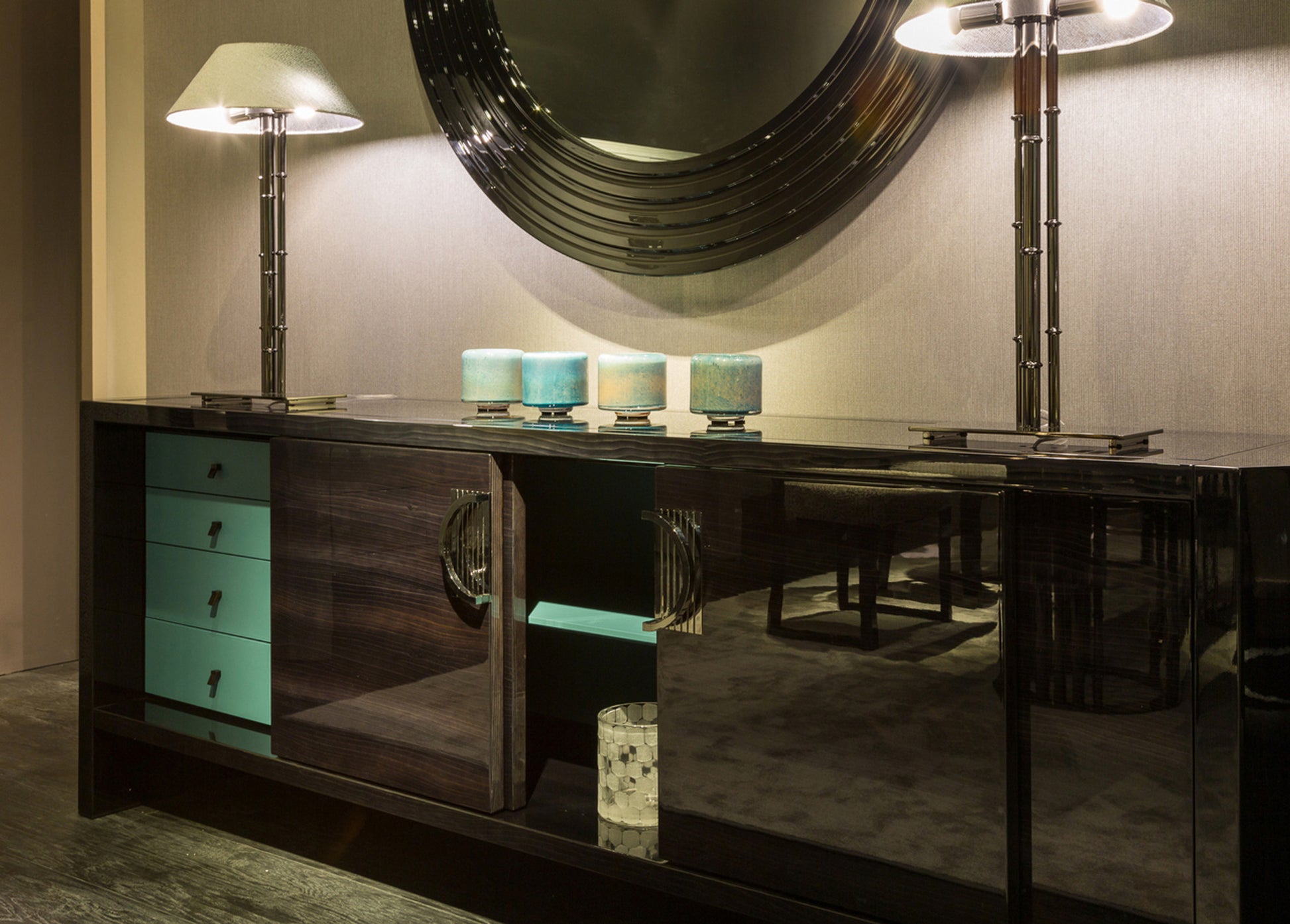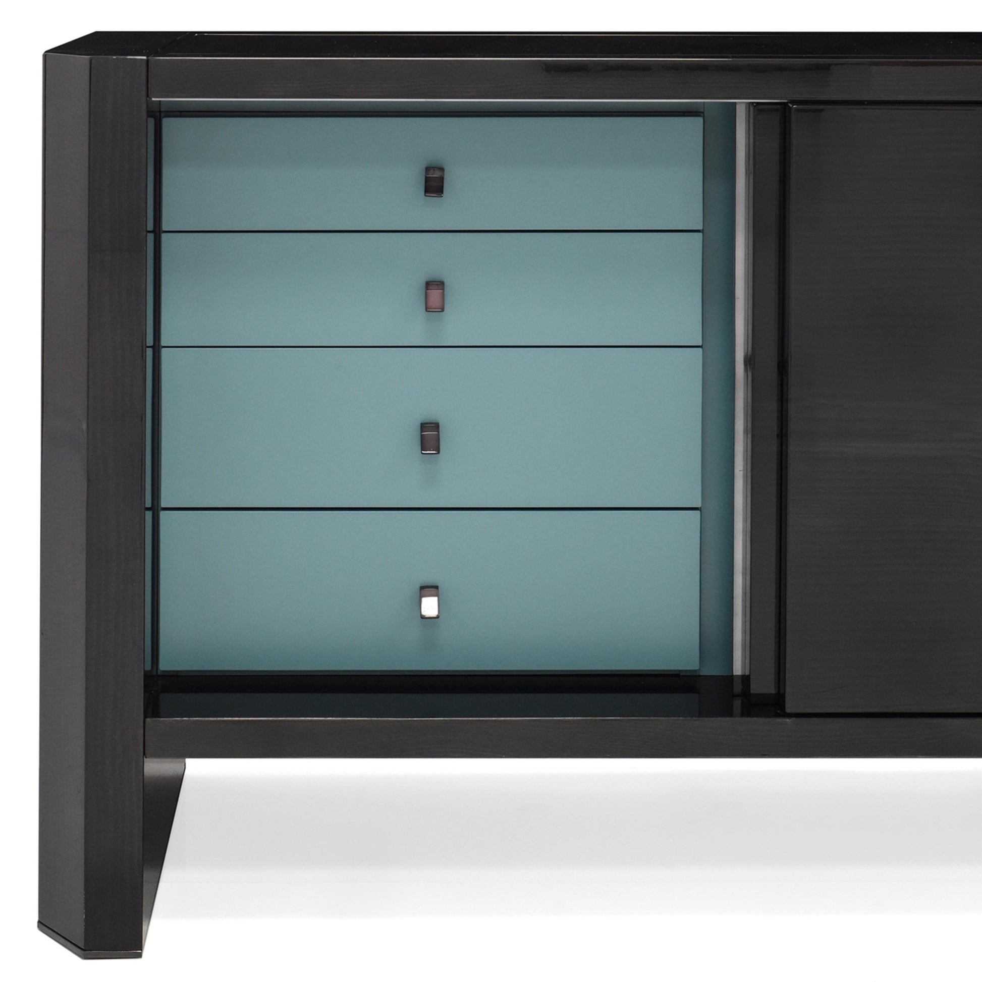 - (4) Tiffany Blue Lacquered Drawers on Left with Black Leather Interior