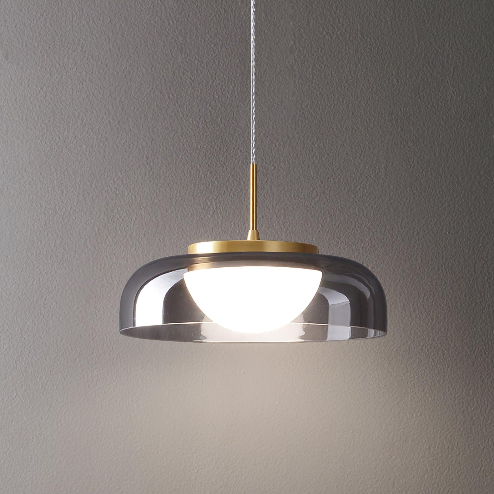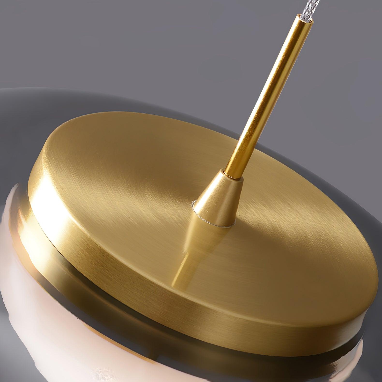 This luminary features a robust metal structure in a soft golden hue, from which a disc of translucent, smoky gray glass suspends, reminiscent of a lunar eclipse.