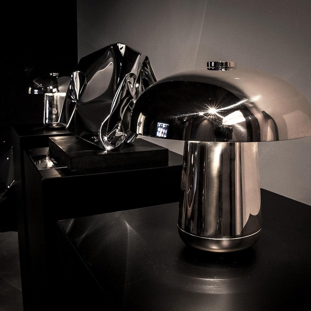 an elegant and delicate mushroom table lamp - Ogno lamp. The Ogno table lamp looks like a mushroom wrapped in a coat. High quality metallic materials result in a shiny finish, The Ogno table lamp can add a soft glow to any desk or interior environment with a unique and distinctive style. It is ideal for the living room, study, bedroom, etc.