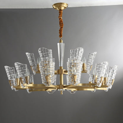 Influenced by the restrained glamour of Gatsby-era Chinan interiors, Renato will make an impact in any space. Brass radiate from a central fixed spine, with faceted Horn column glass casting distinctive light patterns.