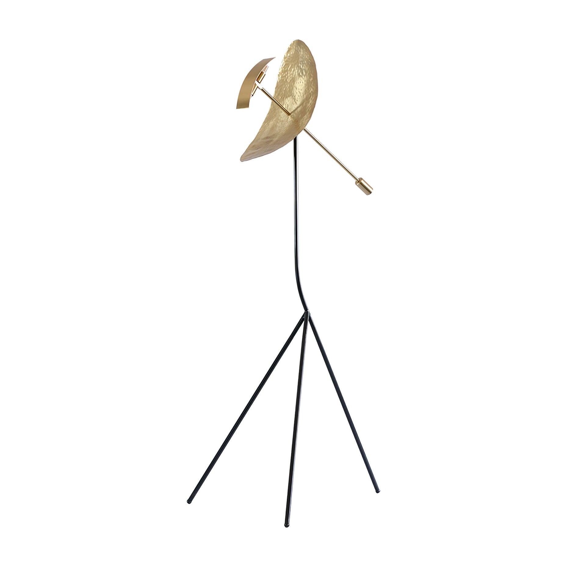 Sculptural yet delicate, this stunning floor lamp features a shimmering oval-shaped diffuser made of hand-hammered brass balanced on a tripod metal base finished in stainless steel. Placed on a slender stem cutting across the center of the lampshade, a slightly curved rectangular strip houses the light source, casting vibrant, rippled reflections evoking water.