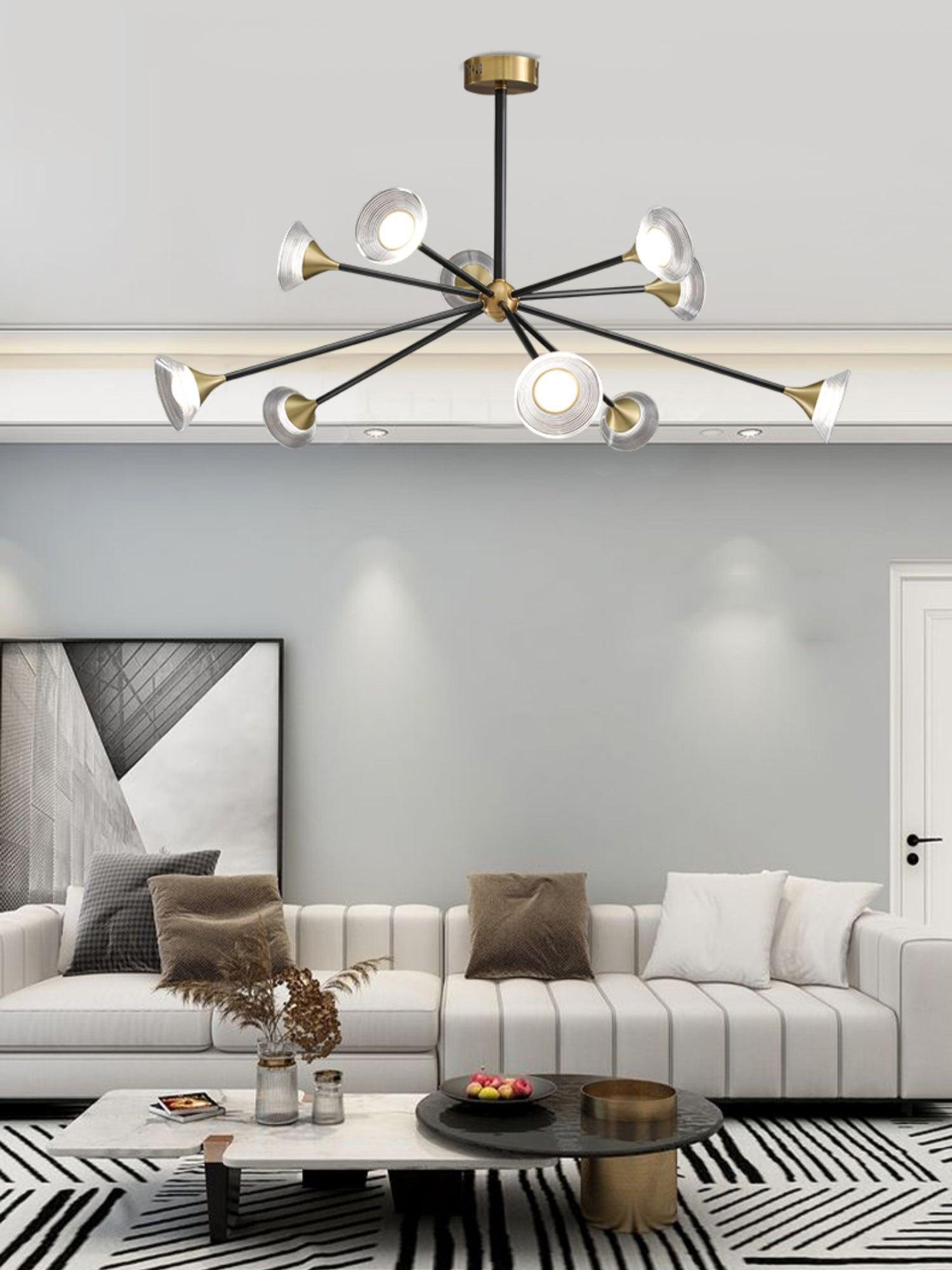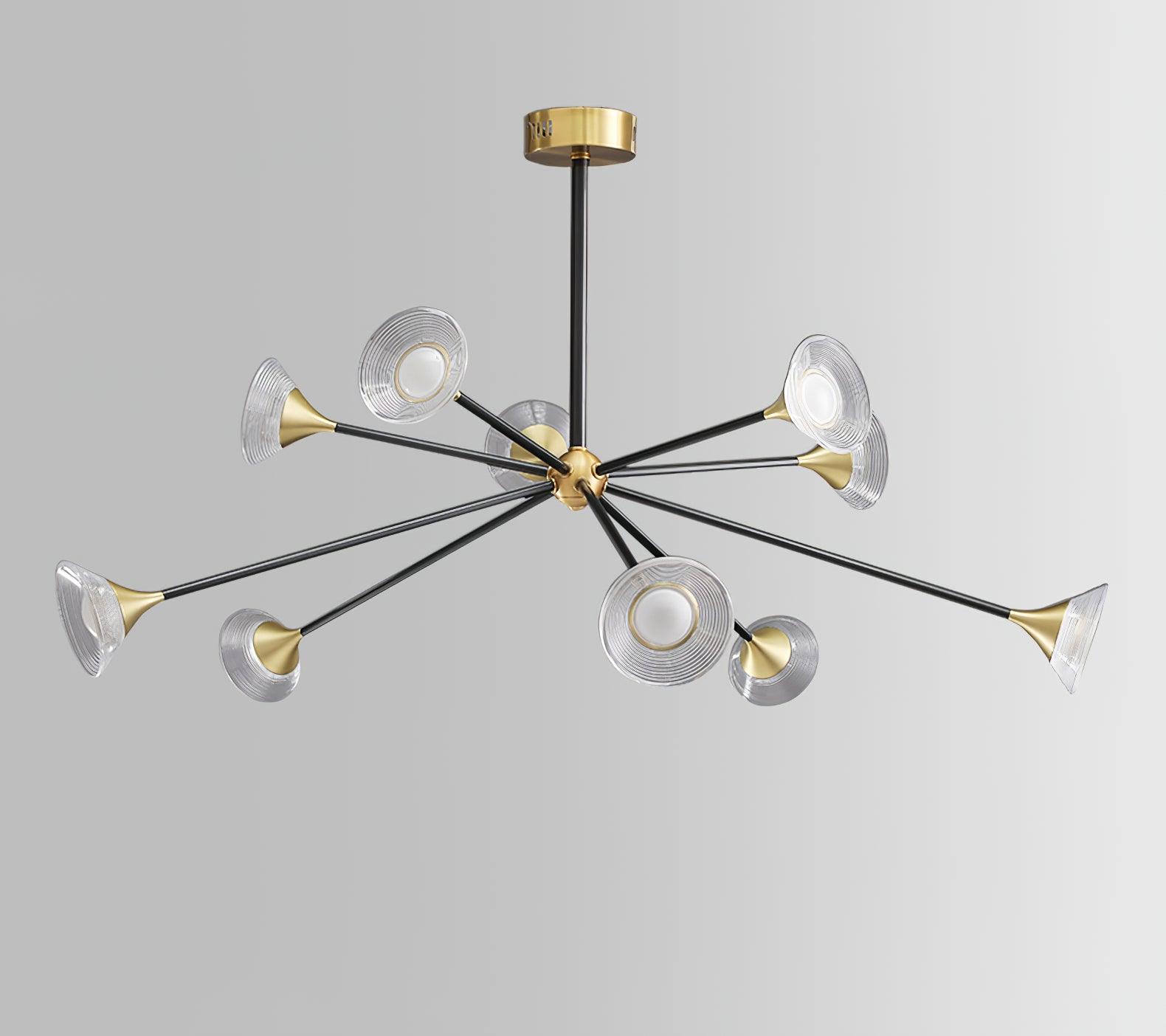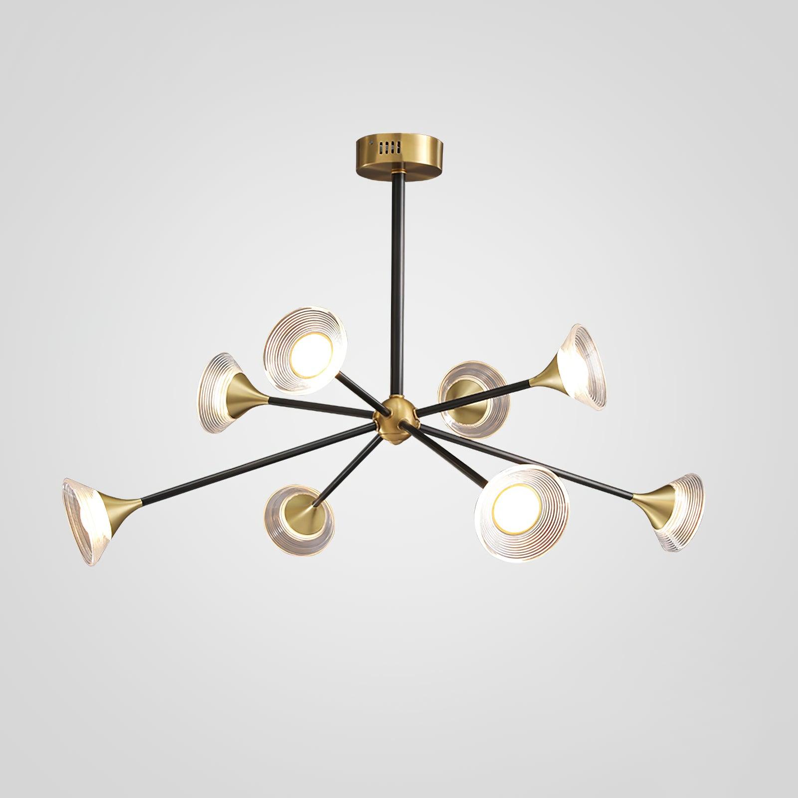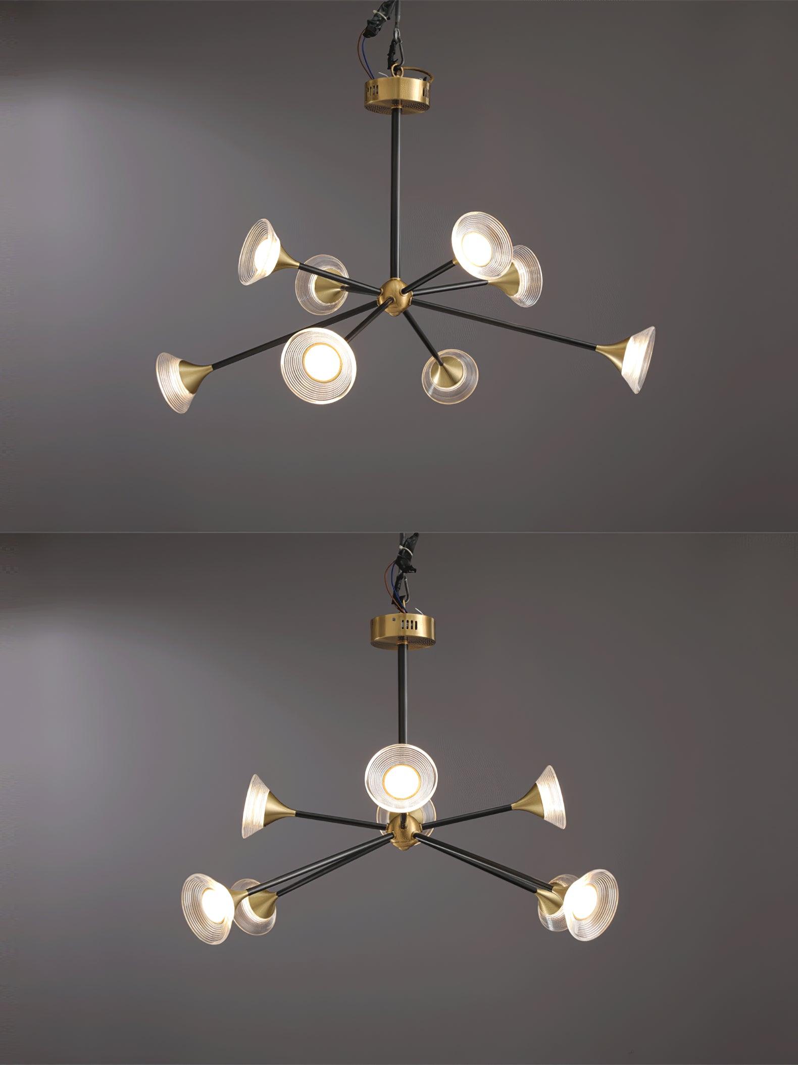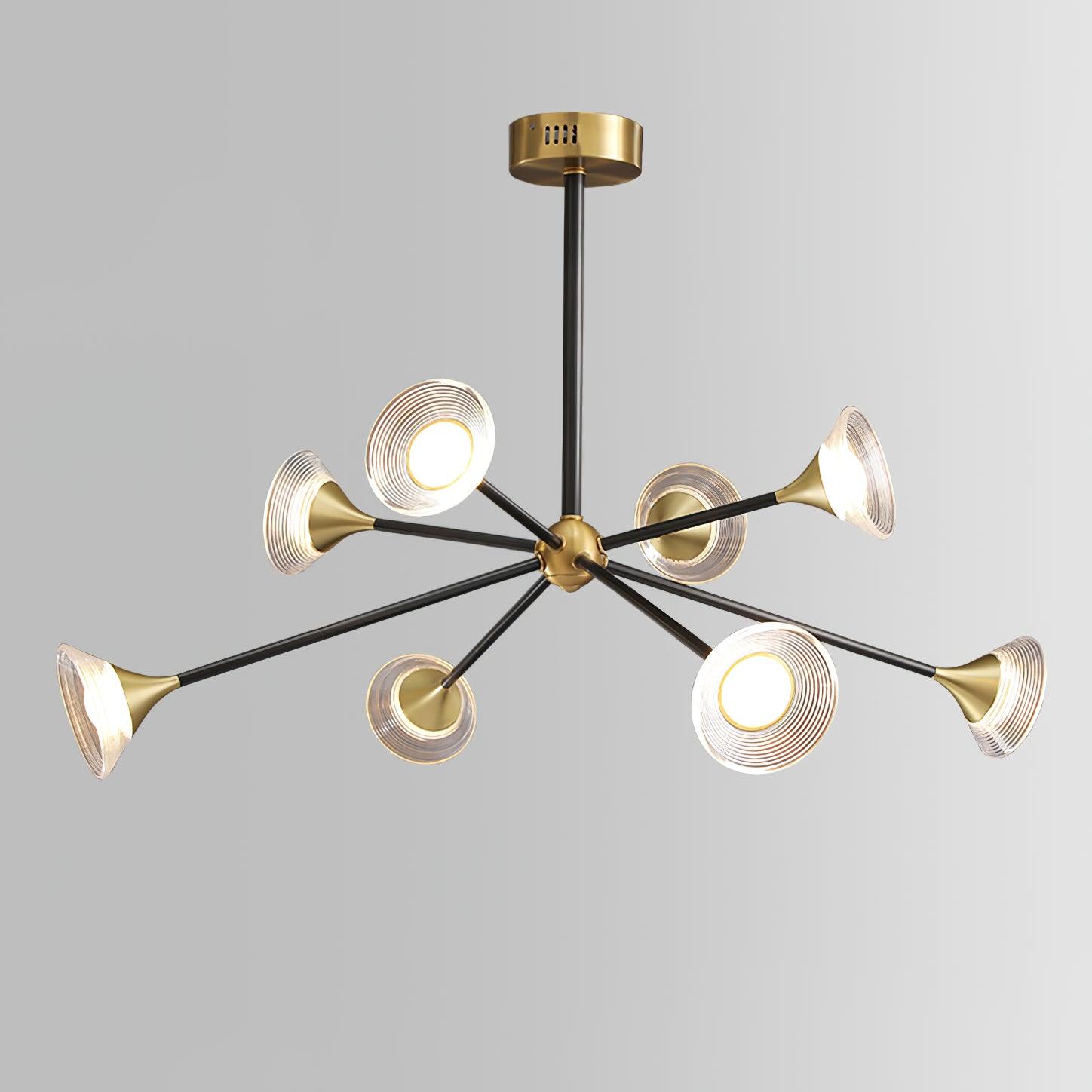 The Tristan Chandelier adds a touch of elegance to any home. Made of durable brass and acrylic, it stands out for its unique trumpet shape and multi-head design. Its sophisticated and eye-catching design is eye-catching while adding a warm, inviting ambience to any room.