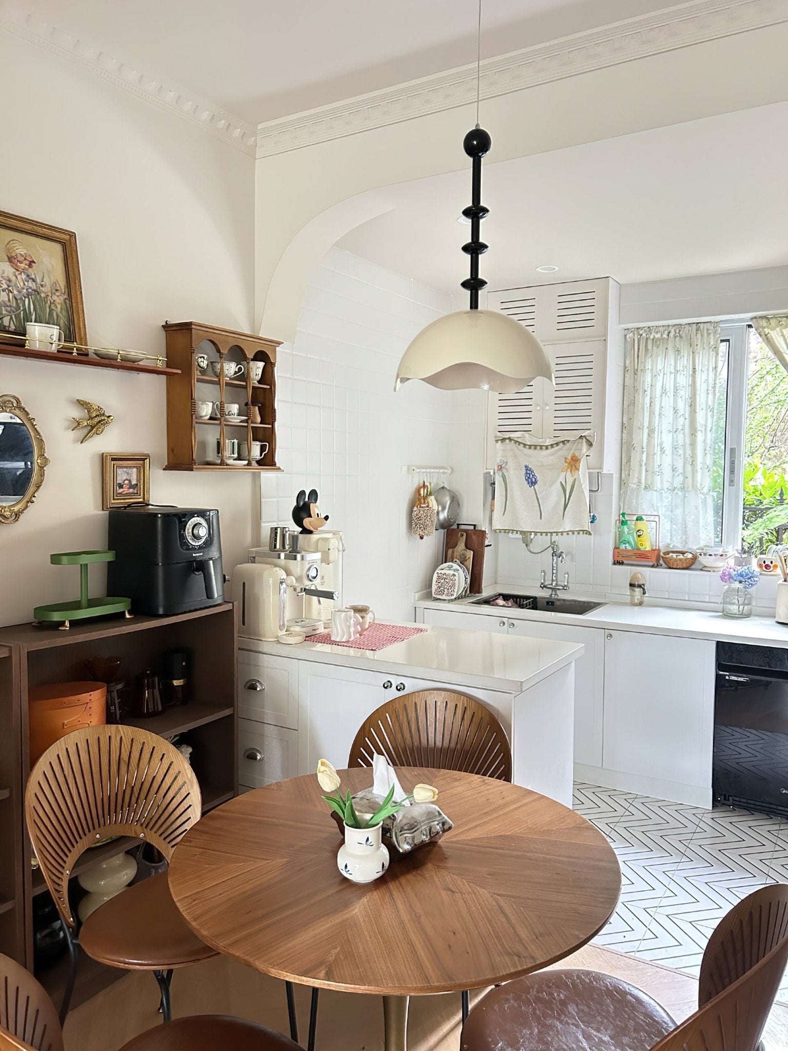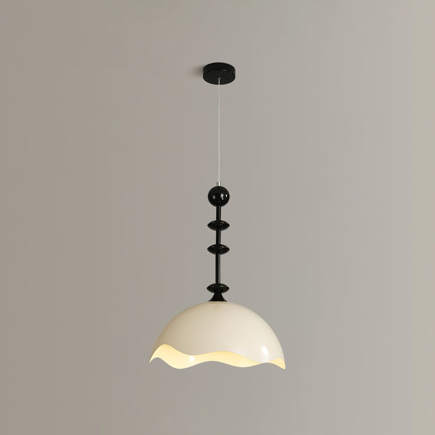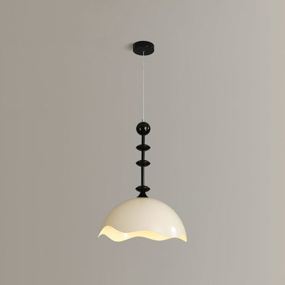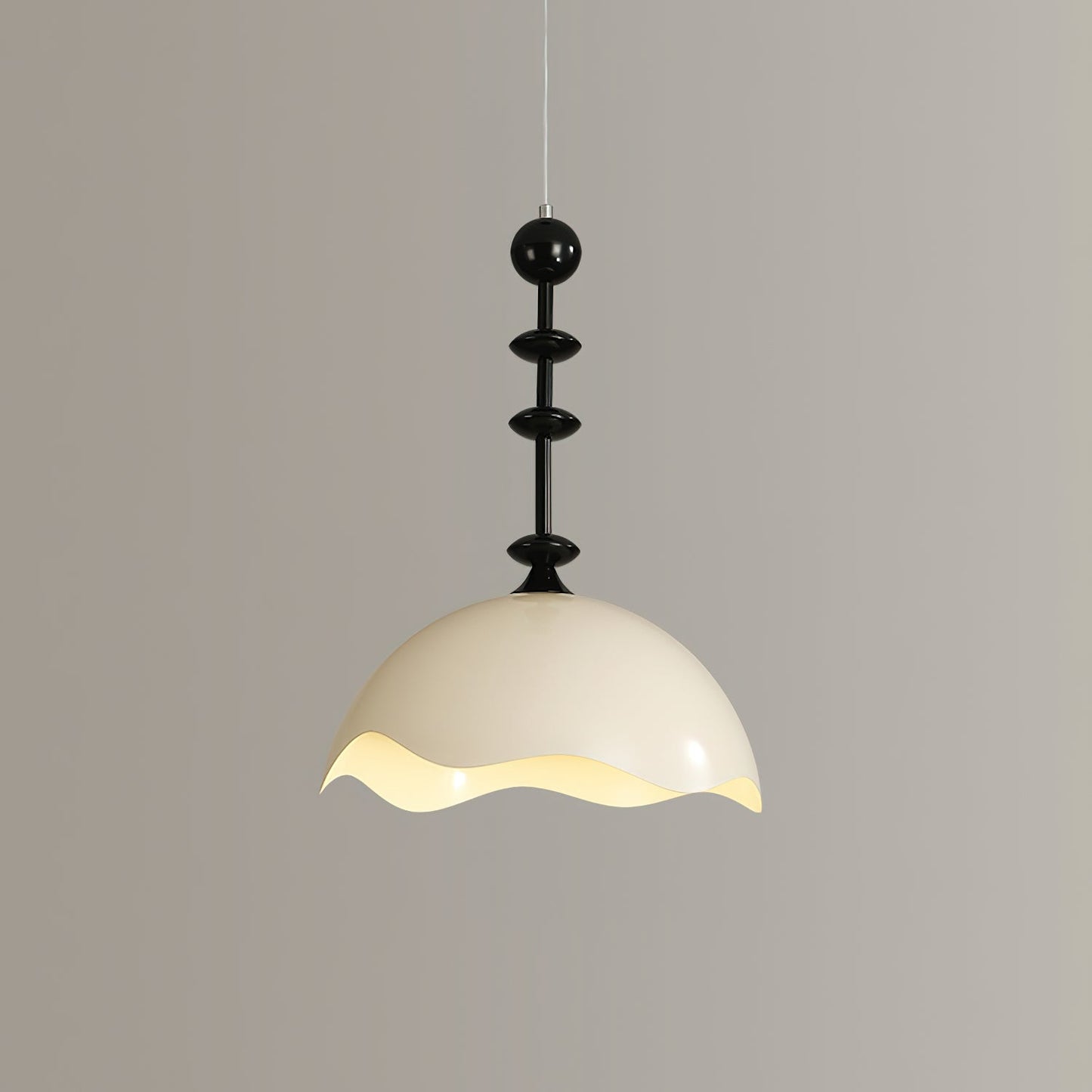 The undulating form of this pendant lamp is inspired by the crest of ocean waves. The fluid, organic shape adds a touch of movement to any space, with its layered design casting intricate patterns of light and shadow. The black and white color scheme further enhances its dynamic presence.