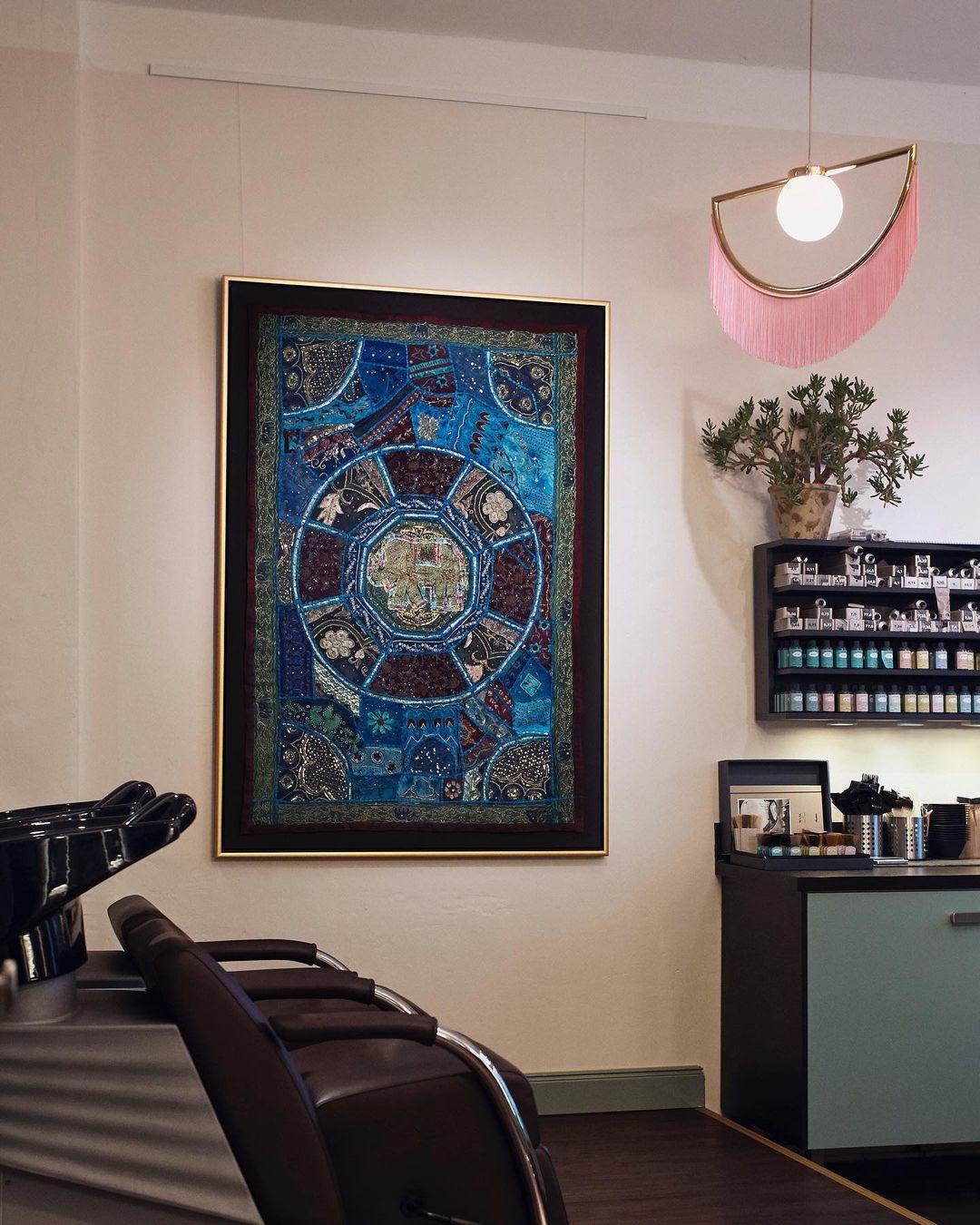 Such a precious jewel, the fringes elegantly adorn the golden metal geometric structure. The rigidity of the rainbow serves as a contradiction to the fragility and delicateness of the fringes. This silky and light curtain gently twirls under the effect of the air currents... Wink draws both the eye and the hand: you want to caress and run your hands through it, slipping them inside this waterfall of wools that are warm to the touch. The bulb is housed in a delicate white glass globe.